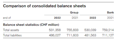 The Balance Sheet shows a decline of CHF 225bn in its total liabilities, confirming a massive decline in its customer deposits of CHF 155bn in 2022.